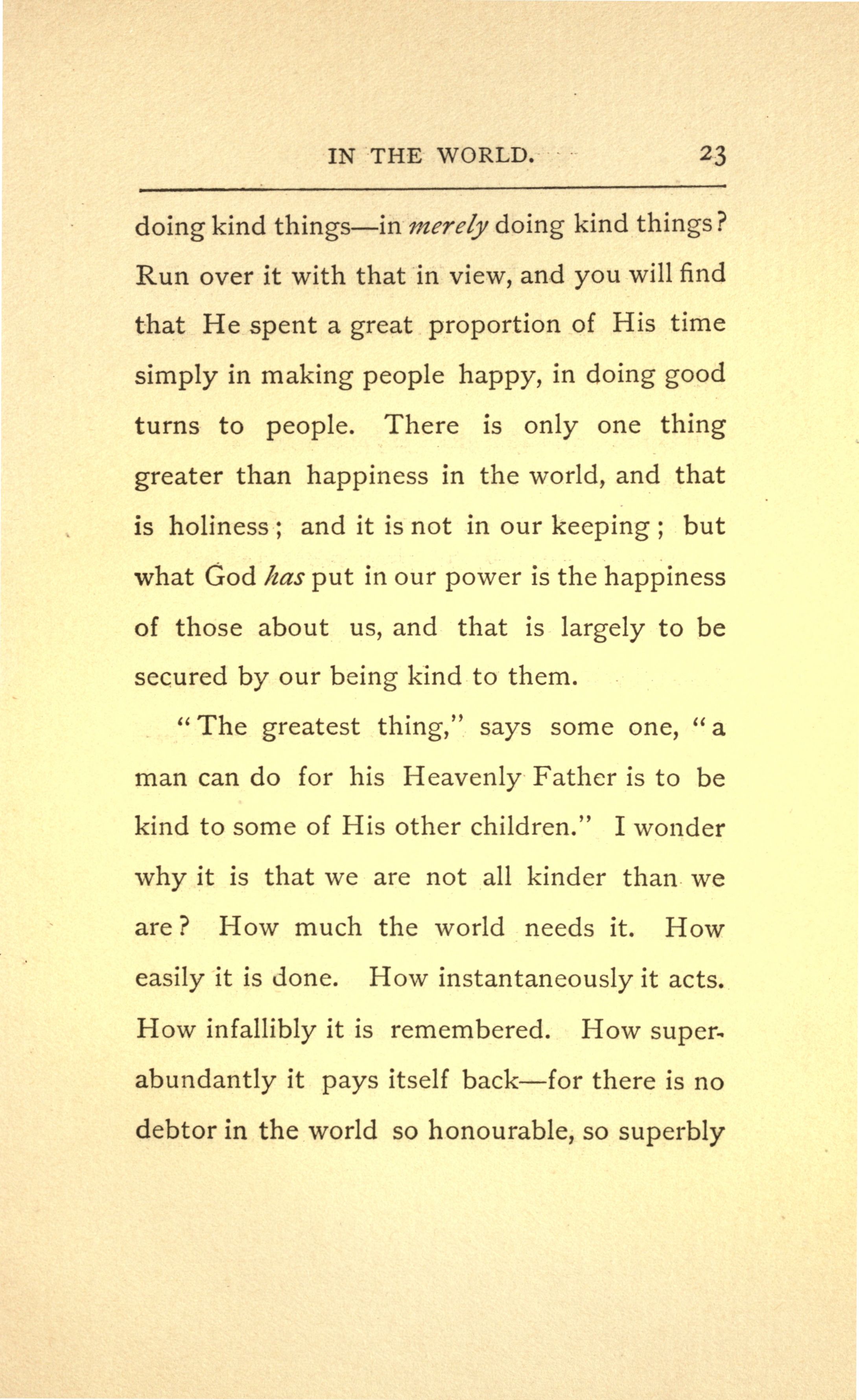 doing kind things---in merely doing kind things? Run over it with that in view, and you will find that He spent a great proportion of His time simply in making people happy, in doing good turns to people. There is only one thing greater than happiness in the world, and that is holiness; and it is not in our keeping; but what God has put in our power is the happiness of those about us, and that is largely to be secured by our being kind to them.
