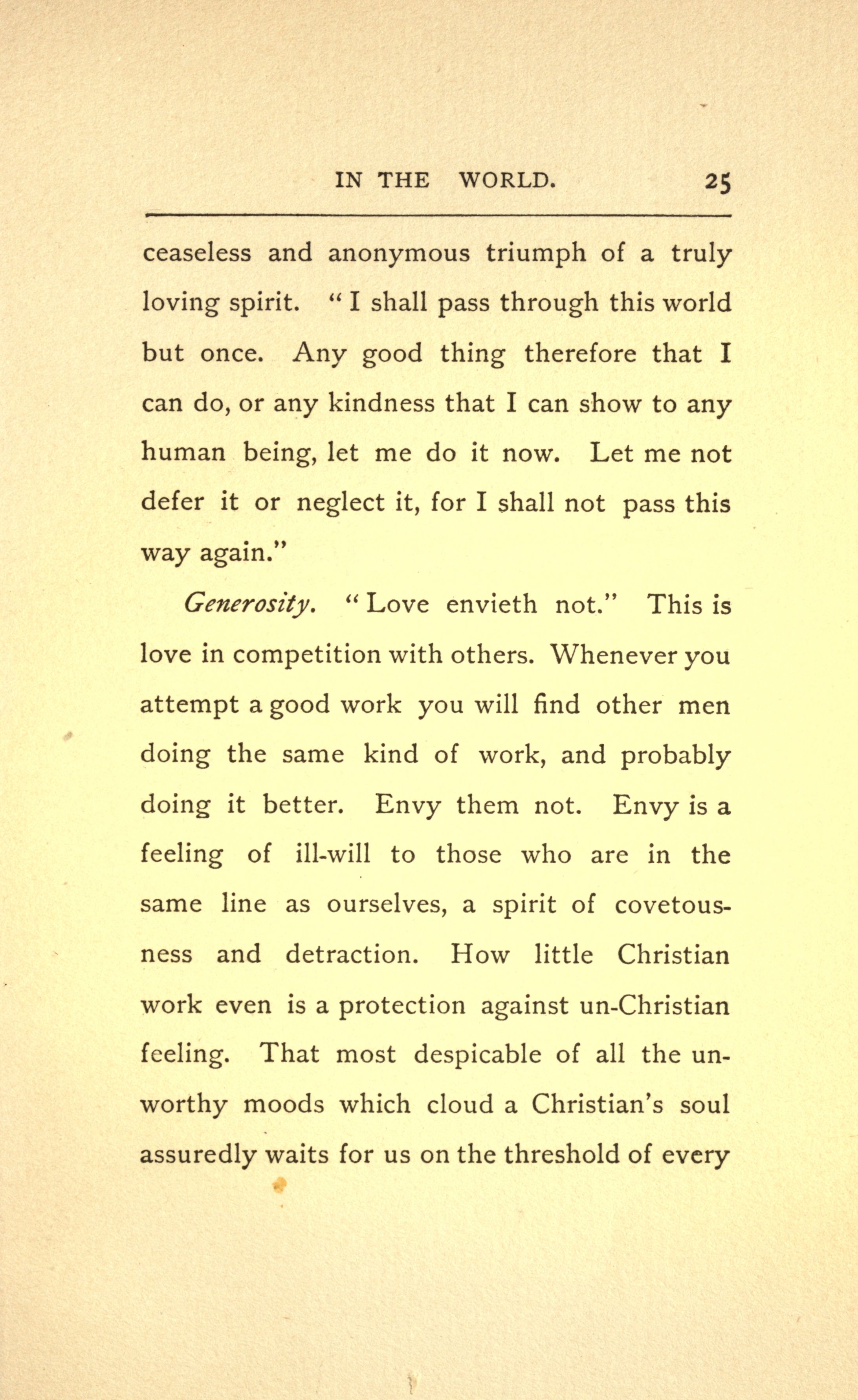 Generosity. "Love envieth not." This is love in competition with others. Whenever you attempt a good work you will find other men doing the same kind of work, and probably doing it better. Envy them not. Envy is a feeling of to those who are in the same line as ourselves, a spirit of covetousness and detraction. How little Christian work even is a protection against un-Christian feeling. That most despicable of all the unworthy moods which cloud a Christian's soul assuredly waits for us on the threshold of every