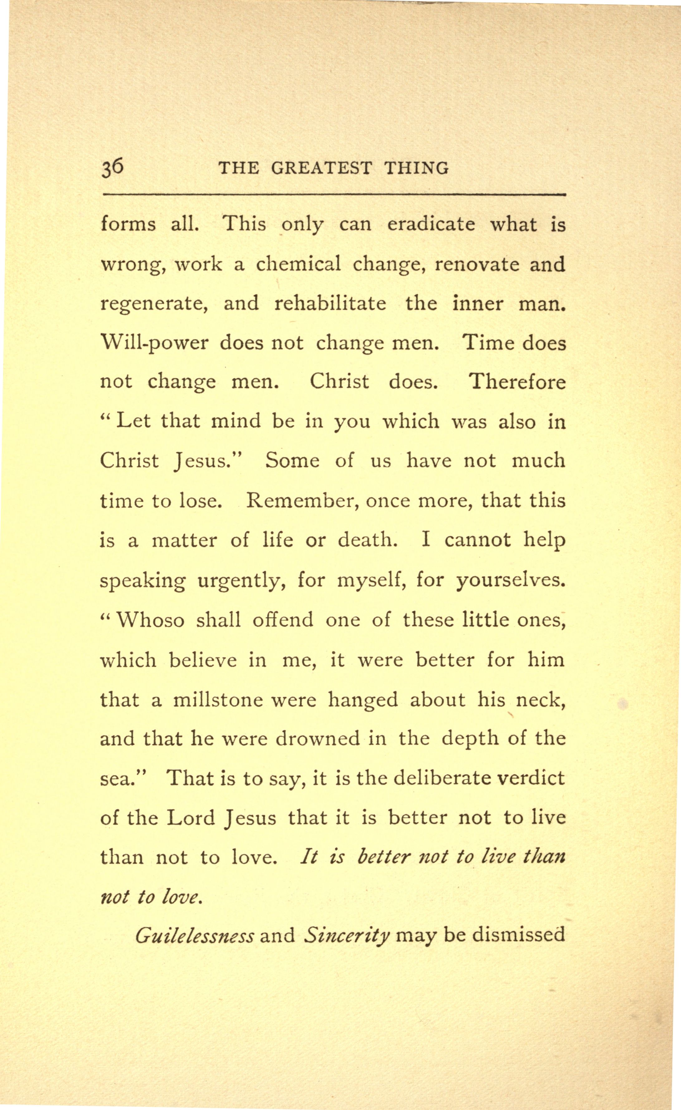"Whoso shall offend one of these little ones, which believe in me, it were better for him that a millstone were hanged about his neck, and that he were drowned in the depth of the sea." That is to say, it is the deliberate verdict of the Lord Jesus that it is better not to live than not to love. It is better not to live than not to love.