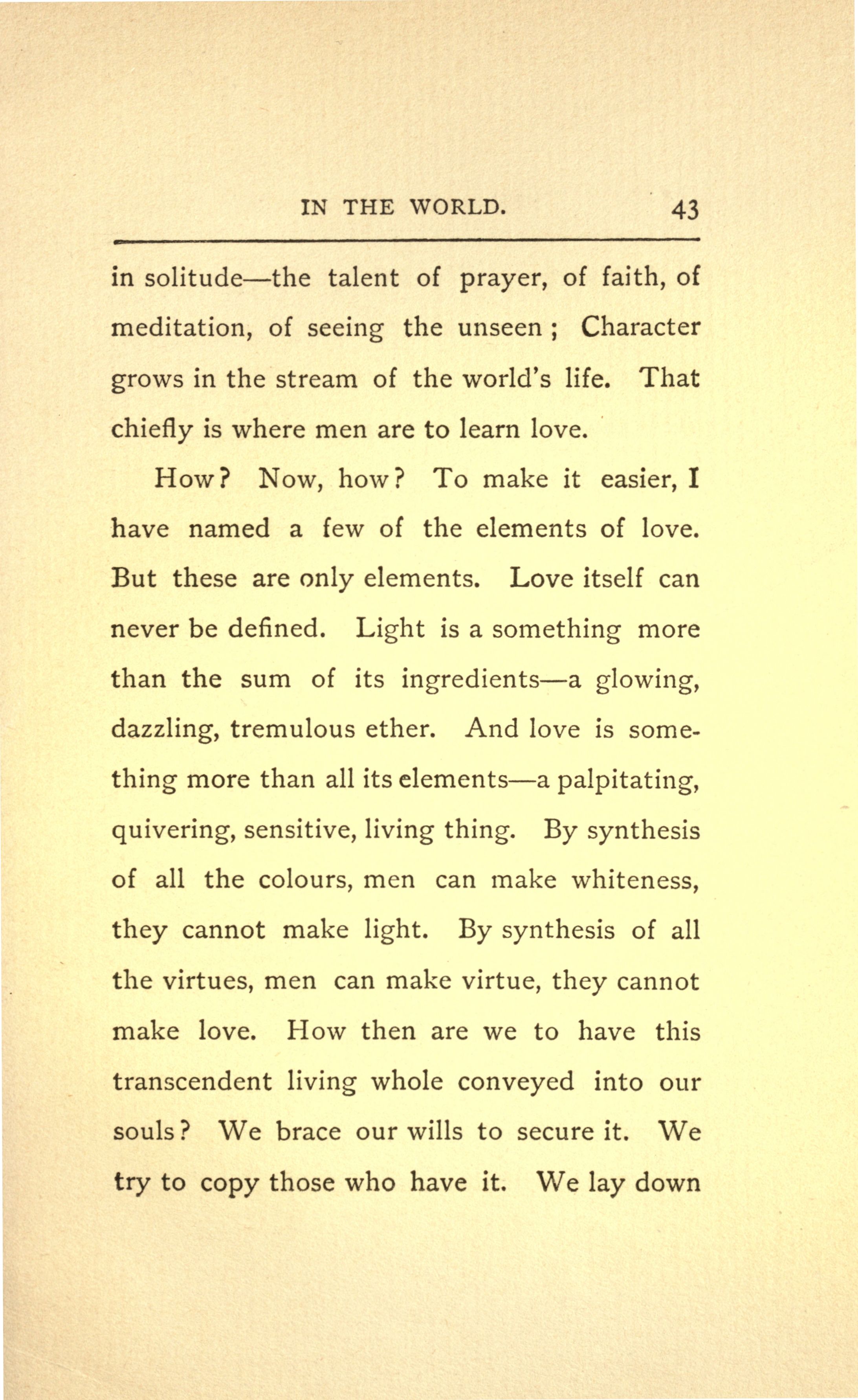 How? Now, how? To make it easier, I have named a few of the elements of love. But these are only elements. Love itself can never be defined. Light is a something more than the sum of its ingredients---a glowing, dazzling, tremulous ether. And love is something more than all its elements---a palpitating, quivering, sensitive, living thing. By synthesis of all the colours, men can make whiteness, they cannot make light. By synthesis of all the virtues, men can make virtue, they cannot make love. How then are we to have this transcendent living whole conveyed into our souls? We brace our wills to secure it. We try to copy those who have it. We lay down