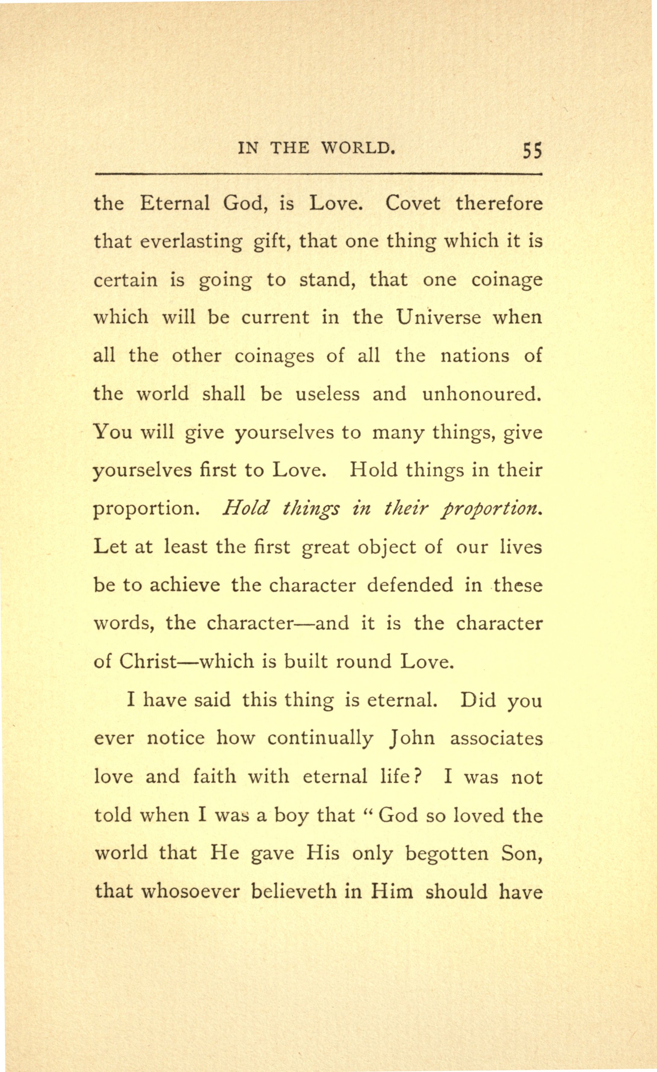 the Eternal God, is Love. Covet therefore that everlasting gift, that one thing which it is certain is going to stand, that one coinage which will be current in the Universe when all the other coinages of all the nations of the world shall be useless and unhonoured. You will give yourselves to many things, give yourselves first to Love. Hold things in their proportion. Hold things in their proportion. Let at least the first great object of our lives be to achieve the character defended in these words, the character---and it is the character of Christ---which is built round Love.