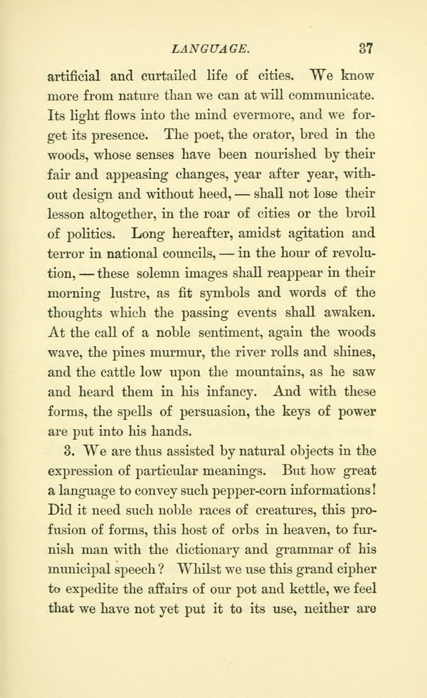 3. We are thus assisted by natural objects in the expression of particular meanings. But how great a language to convey such pepper-corn informations! Did it need such noble races of creatures, this profusion of forms, this host of orbs in heaven, to furnish man with the dictionary and grammar of his municipal speech? Whilst we use this grand cipher to expedite the affairs of our pot and kettle, we feel that we have not yet put it to its use, neither are