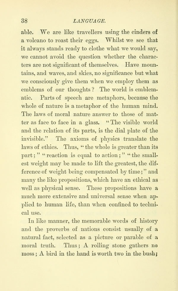 In like manner, the memorable words of history and the proverbs of nations consist usually of a natural fact, selected as a picture or parable of a moral truth. Thus; A rolling stone gathers no moss; A bird in the hand is worth two in the bush;