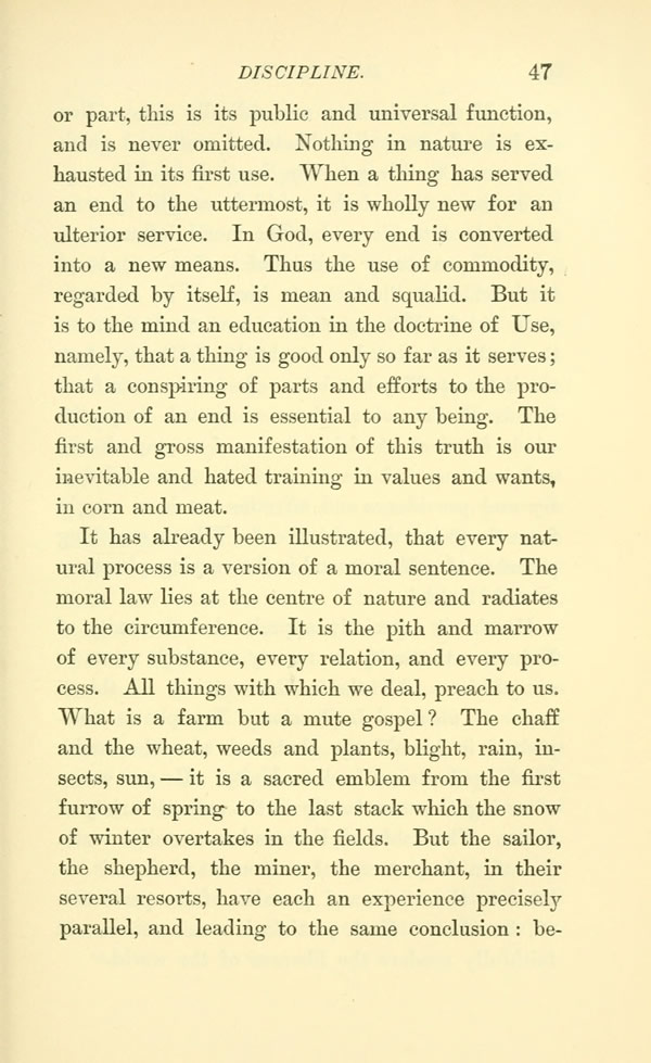 or part, this is its public and universal function, and is never omitted. Nothing in nature is exhausted in its first use. When a thing has served an end to the uttermost, it is wholly new for an ulterior service. In God, every end is converted into a new means. Thus the use of commodity, regarded by itself, is mean and squalid. But it is to the mind an education in the doctrine of Use, namely, that a thing is good only so far as it serves; that a conspiring of parts and efforts to the production of an end is essential to any being. The first and gross manifestation of this truth is our inevitable and hated training in values and wants, in corn and meat.