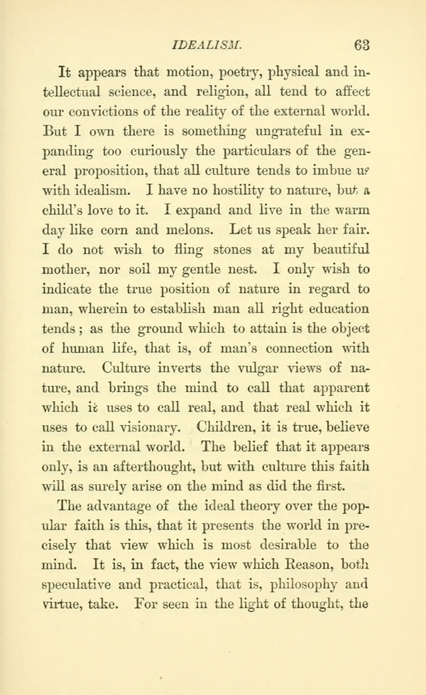 But I own there is something ungrateful in expanding too curiously the particulars of the general proposition, that all culture tends to imbue us with idealism. I have no hostility to nature, but a child's love to it. I expand and live in the warm day like corn and melons. Let us speak her fair. I do not wish to fling stones at my beautiful mother, nor soil my gentle nest. I only wish to indicate the true position of nature in regard to man, wherein to establish man all right education tends; as the ground which to attain is the object of human life, that is, of man's connection with nature. Culture inverts the vulgar views of nature, and brings the mind to call that apparent which it uses to call real, and that real which it uses to call visionary. Children, it is true, believe in the external world. The belief that it appears only, is an afterthought, but with culture this faith will as surely arise on the mind as did the first.