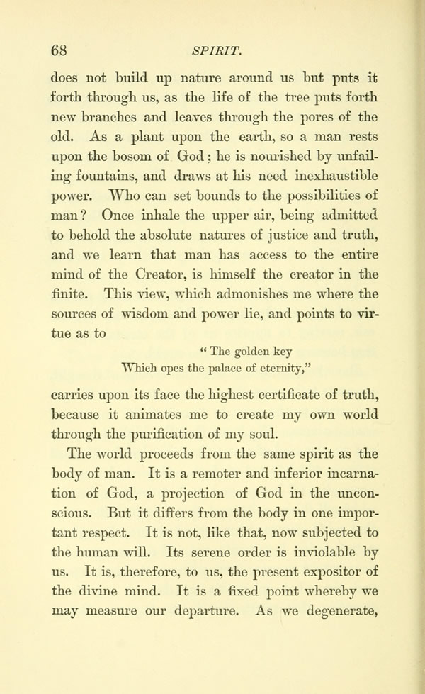The world proceeds from the same spirit as the body of man. It is a remoter and inferior incarnation of God, a projection of God in the unconscious. But it differs from the body in one important respect. It is not, like that, now subjected to the human will. Its serene order is inviolable by us. It is, therefore, to us, the present expositor of the divine mind. It is a fixed point whereby we may measure our departure. As we degenerate,
