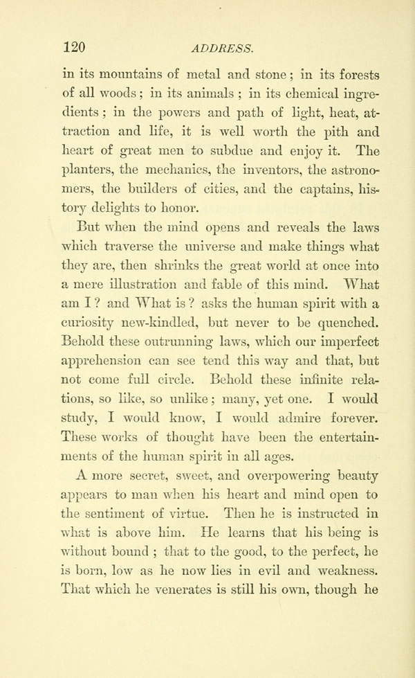 in its mountains of metal and stone; in its forests of all woods; in its animals; in its chemical ingredients; in the powers and path of light, heat, attraction and life, it is well worth the pith and heart of great men to subdue and enjoy it. The planters, the mechanics, the inventors, the astronomers, the builders of cities, and the captains, history delights to honor.