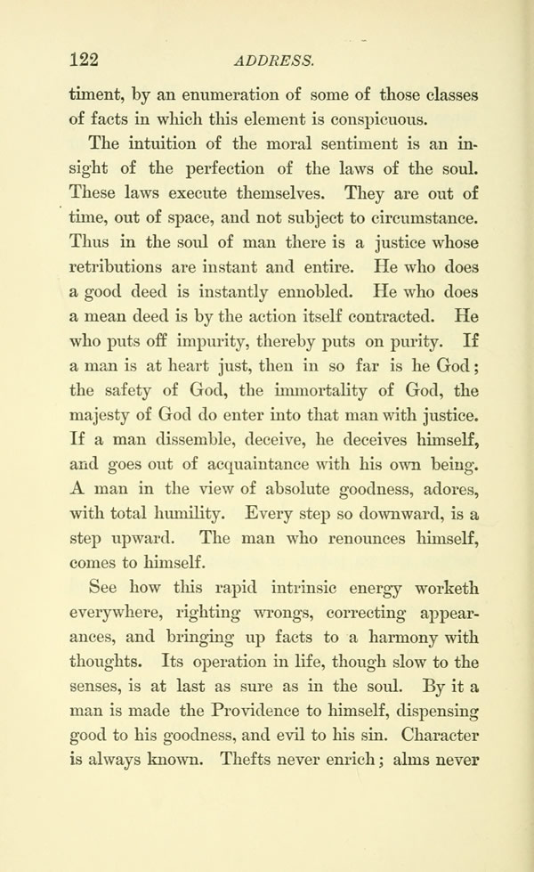 These laws execute themselves. They are out of time, out of space, and not subject to circumstance. Thus in the soul of man there is a justice whose retributions are instant and entire. He who does a good deed is instantly ennobled. He who does a mean deed is by the action itself contracted. He who puts off impurity, thereby puts on purity. If a man is at heart just, then in so far is he God; the safety of God, the immortality of God, the majesty of God do enter into that man with justice.