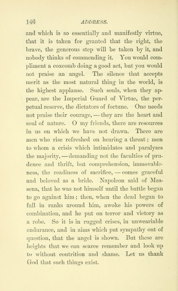 and which is so essentially and manifestly virtue, that it is taken for granted that the right, the brave, the generous step will be taken by it, and nobody thinks of commending it. You would compliment a coxcomb doing a good act, but you would not praise an angel. The silence that accepts merit as the most natural thing in the world, is the highest applause. Such souls, when they am pear, are the Imperial Guard of Virtue, the perpetual reserve, the dictators of fortune. One needs not praise their courage, they are the heart and soul of nature. 0 my friends, there are resources in us on which we have not drawn. There are men who rise refreshed on hearing a threat; men to whom a crisis which intimidates and paralyzes the majority, --- demanding not the faculties of prudence and thrift, but comprehension, immovableness, the readiness of sacrifice, --- comes graceful and beloved as a bride. Napoleon said of Massena, that he was not himself until the battle began to go against him; then, when the dead began to fall hi ranks around him, awoke his powers of combination, and he put on terror and victory as a robe. So it is hi rugged crises, in unweariable endurance, and in aims which put sympathy out of question, that the angel is shown. But these are heights that we can scarce remember and look up to without contrition and shame. Let us thank God that such things exist.