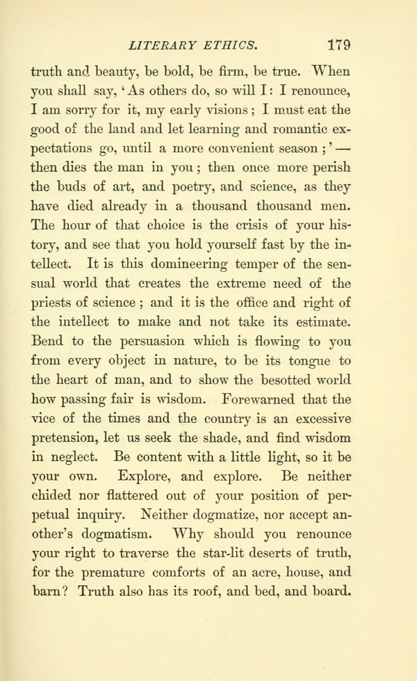 truth and beauty, be bold, be firm, be true. When you shall say, As others do, so will I: I renounce, I am sorry for it, my early visions; I must eat the good of the land and let learning and romantic expectations go, until a more convenient season; then dies the man in you; then once more perish the buds of art, and poetry, and science, as they have died already in a thousand thousand men. The hour of that choice is the crisis of your history, and see that you hold yourself fast by the intellect. It is this domineering temper of the sensual world that creates the extreme need of the priests of science; and it is the office and right of the intellect to make and not take its estimate.