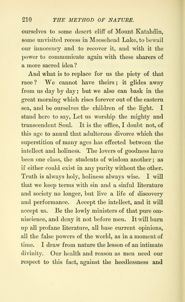 And what is to replace for us the piety of that race? We cannot have theirs; it glides away from us day by day; but we also can bask in the great morning which rises forever out of the eastern sea, and be ourselves the children of the light. I stand here to say, Let us worship the mighty and transcendent Soul. It is the office, I doubt not, of this age to annul that adulterous divorce which the superstition of many ages has effected between the intellect and holiness. The lovers of goodness have been one class, the students of wisdom another; as if either could exist in any purity without the other. Truth is always holy, holiness always wise. I will that we keep terms with sin and a sinful literature and society no longer, but live a life of discovery and performance. Accept the intellect, and it will accept us. Be the lowly ministers of that pure omniscience, and deny it not before men. It will burn up all profane literature, all base current opinions, all the false powers of the world, as in a moment of time. I draw from nature the lesson of an intimate divinity. Our health and reason as men need our respect to this fact, against the heedlessness and