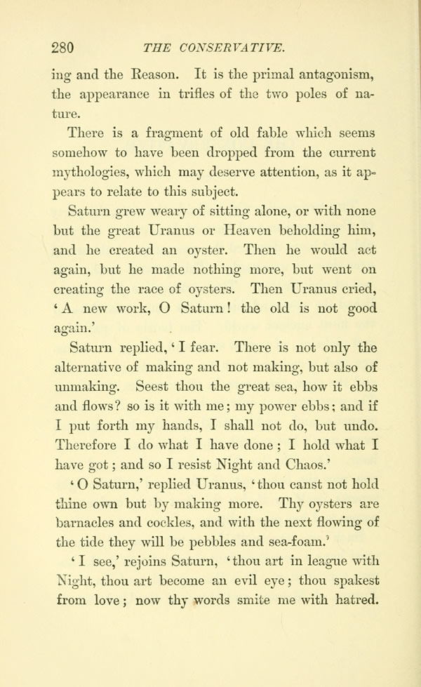 There is a fragment of old fable which seems somehow to have been dropped from the current mythologies, which may deserve attention, as it am pears to relate to this subject. Saturn grew weary of sitting alone, or with none but the great Uranus or Heaven beholding him, and he created an oyster. Then he would act again, but he made nothing more, but went on creating the race of oysters. Then Uranus cried, A new work, 0 Saturn! the old is not good