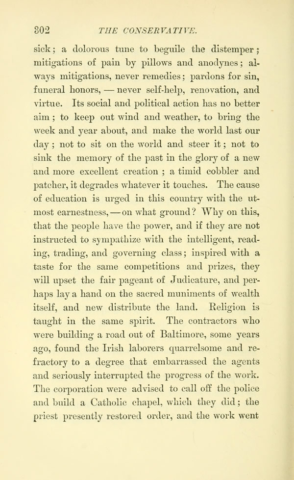 sick; a dolorous tune to beguile the distemper; mitigations of pain by pillows and anodynes; always mitigations, never remedies; pardons for sin, funeral honors, --- never self-help, renovation, and virtue. Its social and political action has no better aim; to keep out wind and weather, to bring the week and year about, and make the world last our (lay; not to sit on the world and steer it; not to sink the memory of the past in the glory of a new and more excellent creation; a timid cobbler and patcher, it degrades whatever it touches. The cause of education is urged in this country with the utmost earnestness, --- on what ground? Why on this, that the people have the power, and if they are not instructed to sympathize with the intelligent, reading, trading, and governing class; inspired with a taste for the same competitions and prizes, they will upset the fair pageant of Judicature, and perhaps lay a hand on the sacred muniments of wealth itself, and new distribute the land. Religion is taught in the same spirit. The contractors who were building a road out of Baltimore, some years ago, found the Irish laborers quarrelsome and refractory to a degree that embarrassed the agents and seriously interrupted the progress of the work.