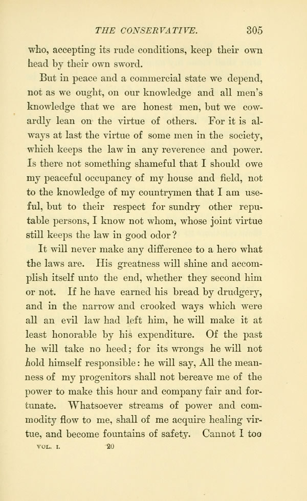 It will never make any difference to a hero what the laws are. His greatness will shine and accomplish itself unto the end, whether they second him or not. If he have earned his bread by drudgery, and in the narrow and crooked ways which were all an evil law had left him, he will make it at least honorable by his expenditure. Of the past he will take no heed; for its wrongs he will not hold himself responsible: he will say, All the meanness of my progenitors shall not bereave me of the power to make this hour and company fair and fortunate. Whatsoever streams of power and commodity flow to me, shall of me acquire healing virtue, and become fountains of safety. Cannot I too