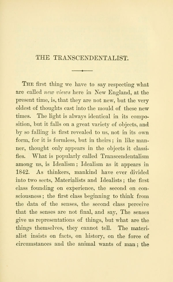 THE first thing we have to say respecting what are called new views here in New England, at the present time, is, that they are not new, but the very oldest of thoughts cast into the mould of these new times. The light is always identical in its composition, but it falls on a great variety of objects, and by so falling is first revealed to us, not in its own form, for it is formless, but in theirs; in like manner, thought only appears in the objects it classifies. What is popularly called Transcendentalism among us, is Idealism; Idealism as it appears in 1842. As thinkers, mankind have ever divided into two sects, Materialists and Idealists; the first class founding on experience, the second on consciousness; the first class beginning to think from the data of the senses, the second class perceive that the senses are not final, and say, The senses give us representations of things, but what are the things themselves, they cannot tell. The materialist insists on facts, on history, on the force of circumstances and the animal wants of man; the