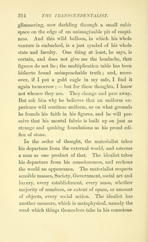 In the order of thought, the materialist takes his departure from the external world, and esteems a man as one product of that. The idealist takes his departure from his consciousness, and reckons the world an appearance. The materialist respects sensible masses, Society, Government, social art and luxury, every establishment, every mass, whether majority of numbers, or extent of space, or amount of objects, every social action. The idealist has another measure, which is metaphysical, namely the rank which things themselves take in his consciousness;