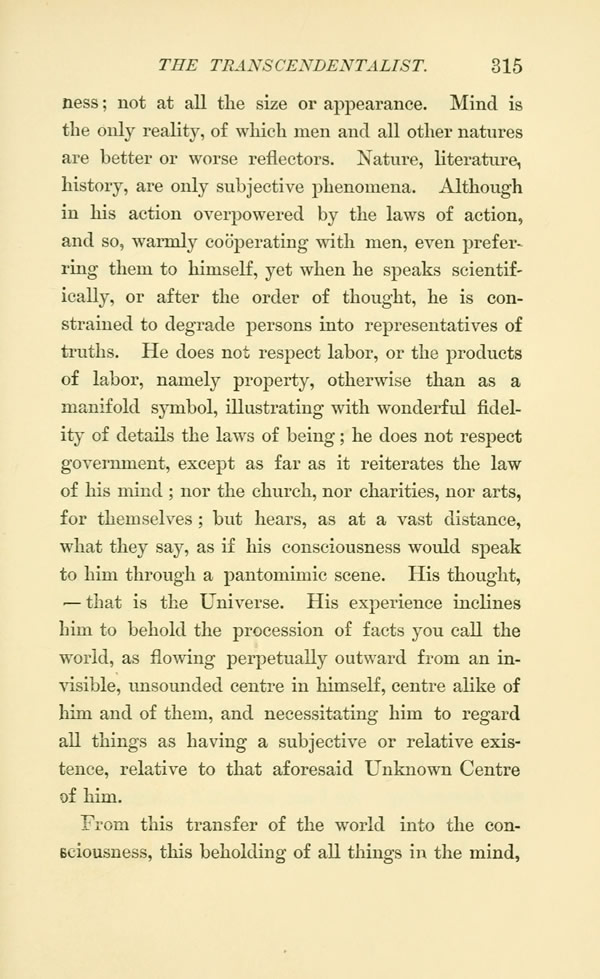 not at all the size or appearance. Mind is the only reality, of which men and all other natures are better or worse reflectors. Nature, literature, history, are only subjective phenomena. Although in his action overpowered by the laws of action, and so, warmly cooperating with men, even preferring them to himself, yet when he speaks scientifically, or after the order of thought, lie is constrained to degrade persons into representatives of truths. He does not respect labor, or the products of labor, namely property, otherwise than as a manifold symbol, illustrating with wonderful fidelity of details the laws of being; he does not respect government, except as far as it reiterates the law of his mind; nor the church, nor charities, nor arts, for themselves; but hears, as at a vast distance, what they say, as if his consciousness would speak to him through a pantomimic scene. His thought, that is the Universe. His experience inclines him to behold the procession of facts you call the world, as flowing perpetually outward from an invisible, unsounded centre in himself, centre alike of him and of them, and necessitating him to regard all things as having a subjective or relative existence, relative to that aforesaid Unknown Centre of him.