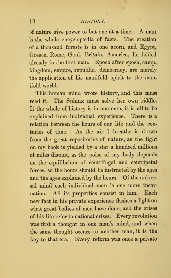 This human mind wrote history, and this must read it. The Sphinx must solve her own riddle. If the whole of history is in one man, it is all to be explained from individual experience. There is a relation between the hours of our life and the centuries of time. As the air I breathe is drawn from the great repositories of nature, as the light on my book is yielded by a star a hundred millions of miles distant, as the poise of my body depends on the equilibrium of centrifugal and centripetal forces, so the hours should be instructed by the ages and the ages explained by the hours. Of the universal mind each individual man is one more incarnation. All its properties consist in him. Each new fact in his private experience flashes a light on what great bodies of men have done, and the crises of his life refer to national crises. Every revolution was first a thought in one man's mind, and when the same thought occurs to another man, it is the key to that era. Every reform was once a private