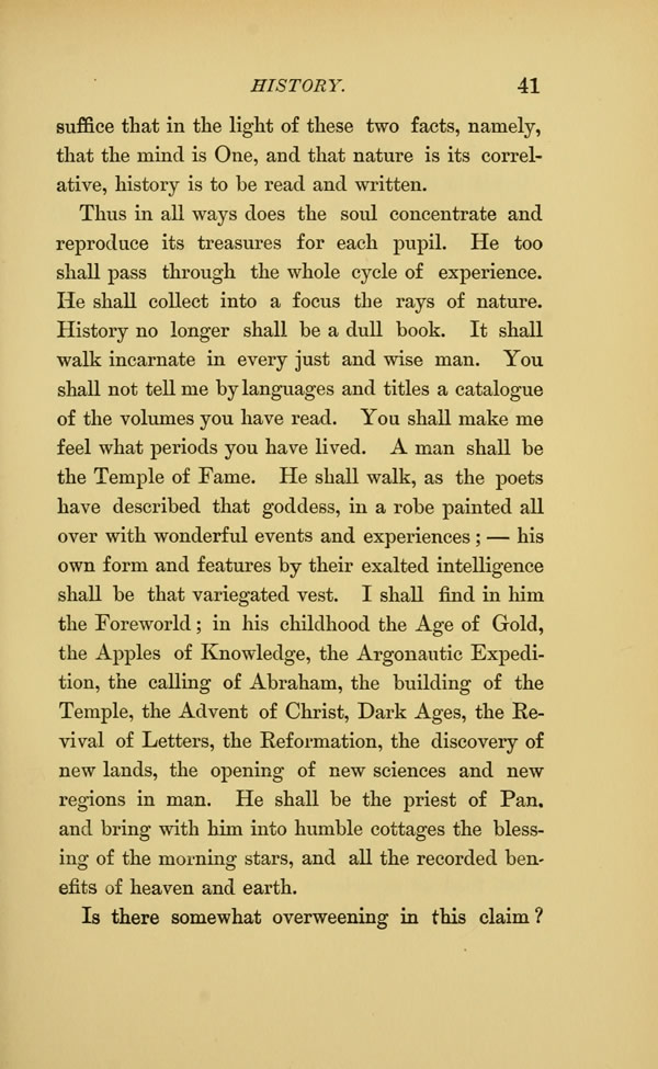 History no longer shall be a dull book. It shall walk incarnate in every just and wise man. You shall not tell me by languages and titles a catalogue of the volumes you have read. You shall make me feel what periods you have lived. A man shall be the Temple of Fame. He shall walk, as the poets have described that goddess, in a robe painted all over with wonderful events and experiences; -- his own form and features by their exalted intelligence shall be that variegated vest. I shall find in him the Foreworld; in his childhood the Age of Gold, the Apples of Knowledge, the Argonautic Expedition, the calling of Abraham, the building of the Temple, the Advent of Christ, Dark Ages, the Revival of Letters, the Reformation, the discovery of new lands, the opening of new sciences and new regions in man. He shall be the priest of Pan, and bring with him into humble cottages the blessing of the morning stars, and all the recorded benefits of heaven and earth.