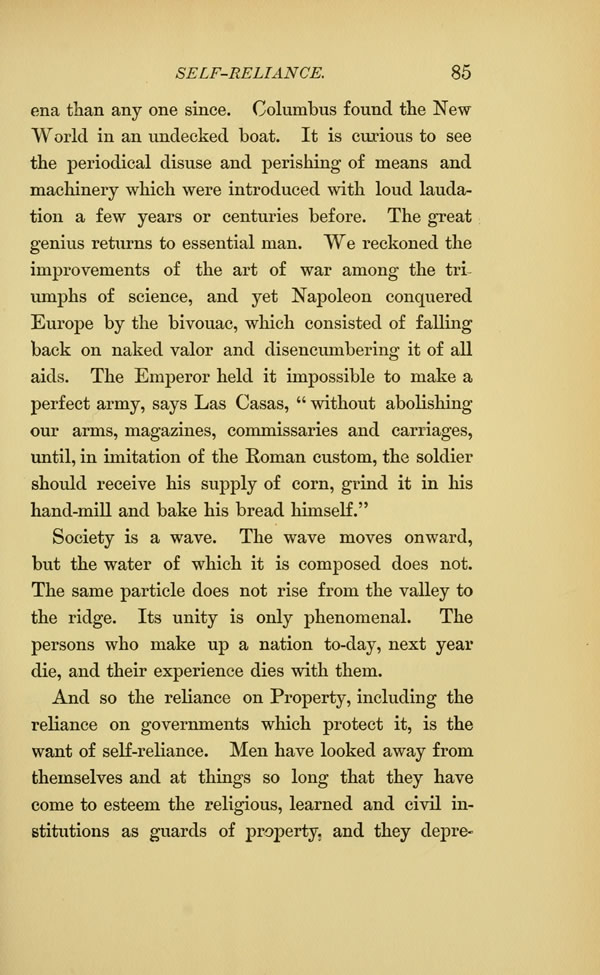 than any one since. Columbus found the New World in an undecked boat. It is curious to see the periodical disuse and perishing of means and machinery which were introduced with loud laudation a few years or centuries before. The great genius returns to essential man. We reckoned the improvements of the art of war among the triumphs of science, and yet Napoleon conquered Europe by the bivouac, which consisted of falling back on naked valor and disencumbering it of all aids. The Emperor held it impossible to make a perfect army, says Las Casas, " without abolishing our arms, magazines, commissaries and carriages, until, in imitation of the Roman custom, the soldier should receive his supply of corn, grind it in his hand-mill and bake his bread himself."