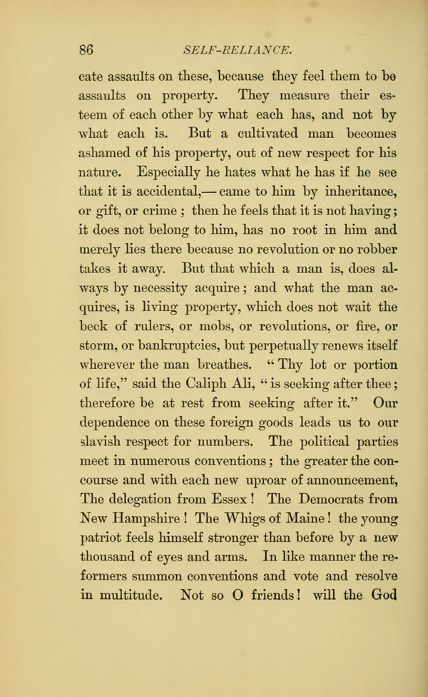 assaults on these, because they feel them to be assaults on property. They measure their esteem of each other by what each has, and not by what each is. But a cultivated man becomes ashamed of his property, out of new respect for his nature. Especially he hates what he has if he see that it is accidental, -- came to him by inheritance, or gift, or crime; then he feels that it is not having; it does not belong to him, has no root in him and merely lies there because no revolution or no robber takes it away. But that which a man is, does always by necessity acquire; and what the man acquires, is living property, which does not wait the beck of rulers, or mobs, or revolutions, or fire, or storm, or bankruptcies, but perpetually renews itself wherever the man breathes. " Thy lot or portion of life," said the Caliph Ali, " is seeking after thee; therefore be at rest from seeking after it." Our dependence on these foreign goods leads us to our slavish respect for numbers. The political parties meet in numerous conventions; the greater the concourse and with each new uproar of announcement,