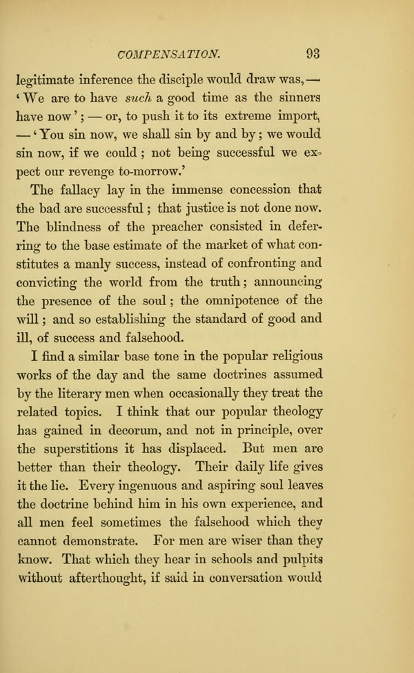 The blindness of the preacher consisted in deferring to the base estimate of the market of what constitutes a manly success, instead of confronting and convicting the world from the truth; announcing the presence of the soul the omnipotence of the will; and so establishing the standard of good and ill, of success and falsehood.