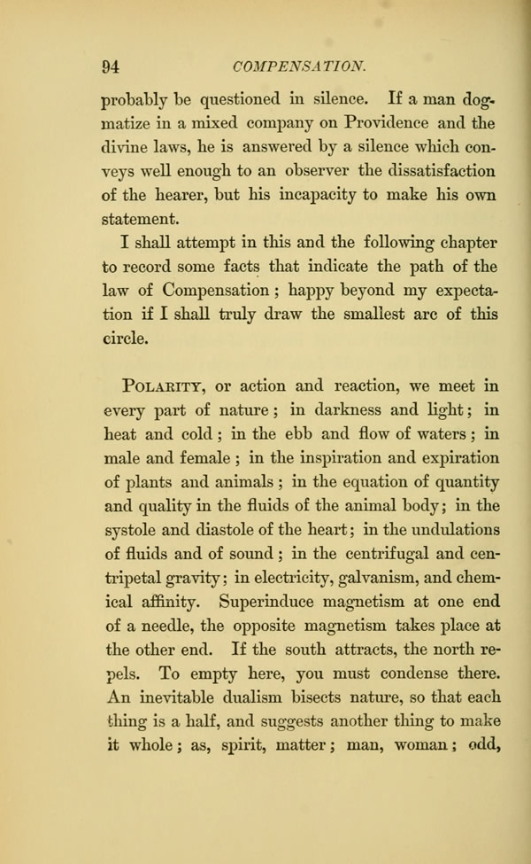 I shall attempt in this and the following chapter to record some facts that indicate the path of the law of Compensation; happy beyond my expectation if I shall truly draw the smallest arc of this circle.