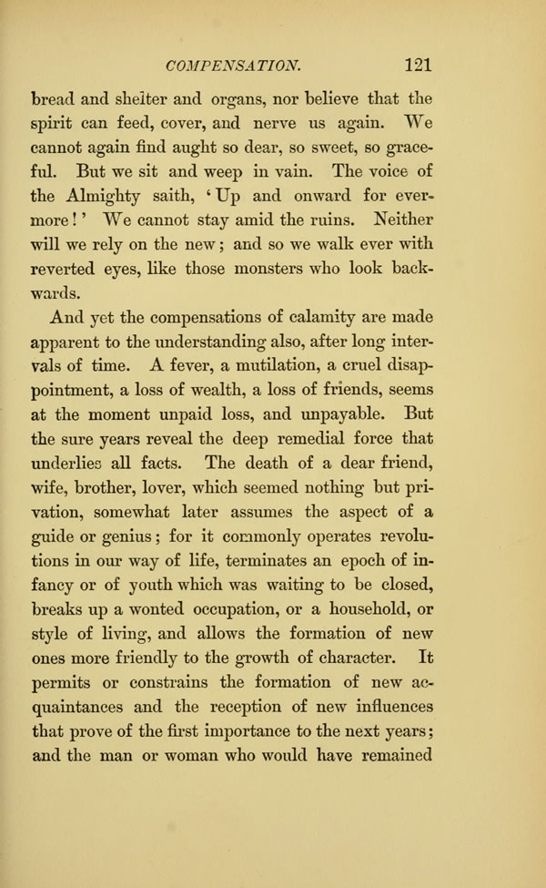 And yet the compensations of calamity are made apparent to the understanding also, after long intervals of time. A fever, a mutilation, a cruel disappointment, a loss of wealth, a loss of friends, seems at the moment unpaid loss, and unpayable. But the sure years reveal the deep remedial force that underlies all facts. The death of a dear friend, wife, brother, lover, which seemed nothing but privation, somewhat later assumes the aspect of a guide or genius; for it commonly operates revolutions in our way of life, terminates an epoch of infancy or of youth which was waiting to be closed, breaks up a wonted occupation, or a household, or style of living, and allows the formation of new ones more friendly to the growth of character. It permits or constrains the formation of new acquaintances and the reception of new influences that prove of the first importance to the next years; and the man or woman who would have remained