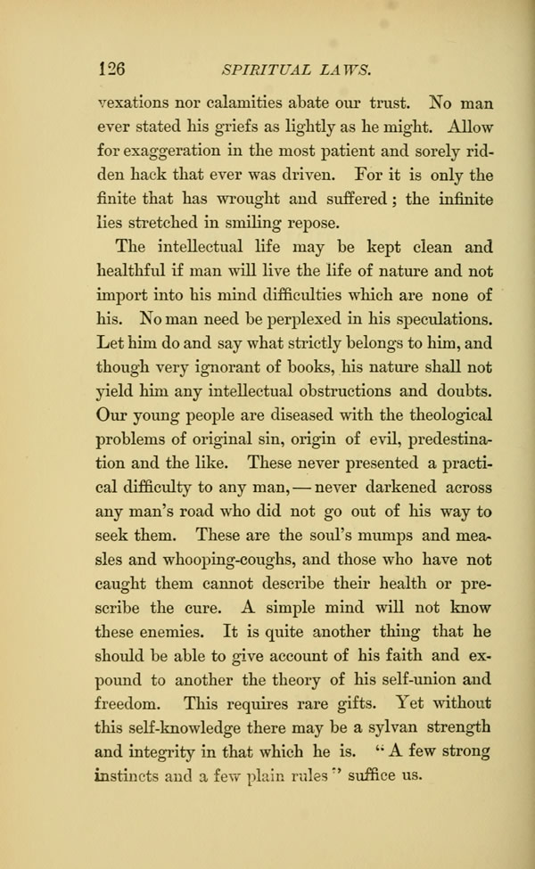 Our young people are diseased with the theological problems of original sin, origin of evil, predestination and the like. These never presented a practical difficulty to any man, -- never darkened across any man's road who did not go out of his way to seek them. These are the soul's mumps and measles and whooping-coughs, and those who have not caught them cannot describe their health or prescribe the cure. A simple mind will not know these enemies. It is quite another thing that he should be able to give account of his faith and expound to another the theory of his self-union and freedom. This requires rare gifts. Yet without this self-knowledge there may be a sylvan strength and integrity in that which he is. "A few strong instincts and a few plain rules" suffice us.