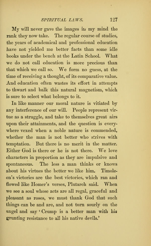 And education often wastes its effort in attempts to thwart and balk this natural magnetism, which is sure to select what belongs to it. In like manner our moral nature is vitiated by any interference of our will. People represent virtue as a struggle, and take to themselves great airs upon their attainments, and the question is everywhere vexed when a noble nature is commended, whether the man is not better who strives with temptation. But there is no merit in the matter.