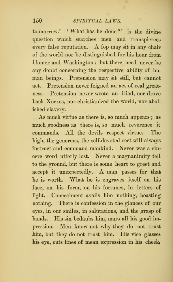 tomorrow."What has he done?" is the divine question which searches men and transpierces every false reputation. A fop may sit in any chair of the world nor be distinguished for his hour from Homer and Washington; but there need never be any doubt concerning the respective ability of human beings. Pretension may sit still, but cannot act. Pretension never feigned an act of real greatness. Pretension never wrote an Iliad, nor drove back Xerxes, nor christianized the world, nor abolished slavery.