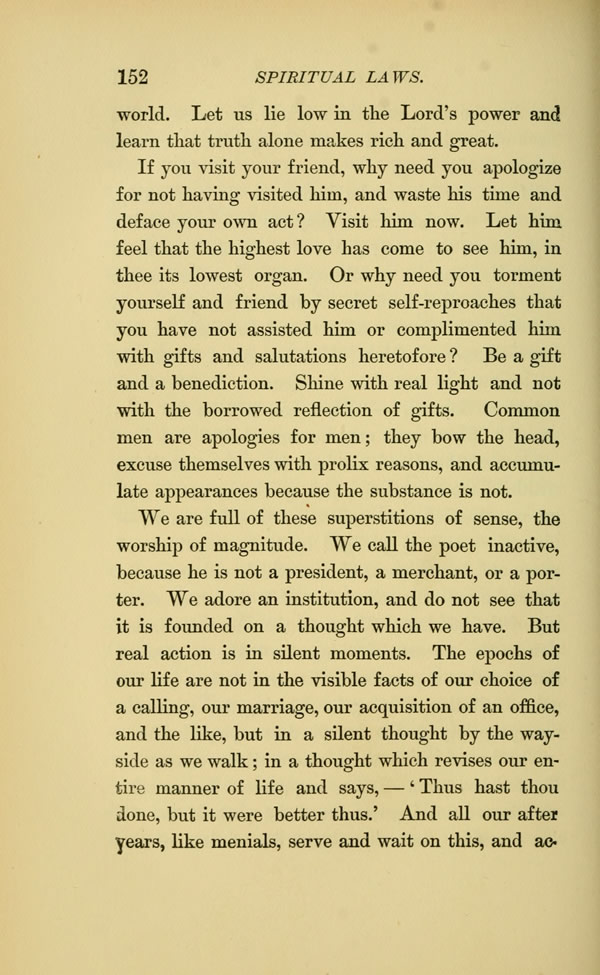 If you visit your friend, why need you apologize for not having visited him, and waste his time and deface your own act? Visit him now. Let him feel that the highest love has come to see him, in thee its lowest organ. Or why need you torment yourself and friend by secret self-reproaches that you have not assisted him or complimented him with gifts and salutations heretofore? Be a gift and a benediction. Shine with real light and not with the borrowed reflection of gifts. Common men are apologies for men; they bow the head, excuse themselves with prolix reasons, and accumulate appearances because the substance is not.