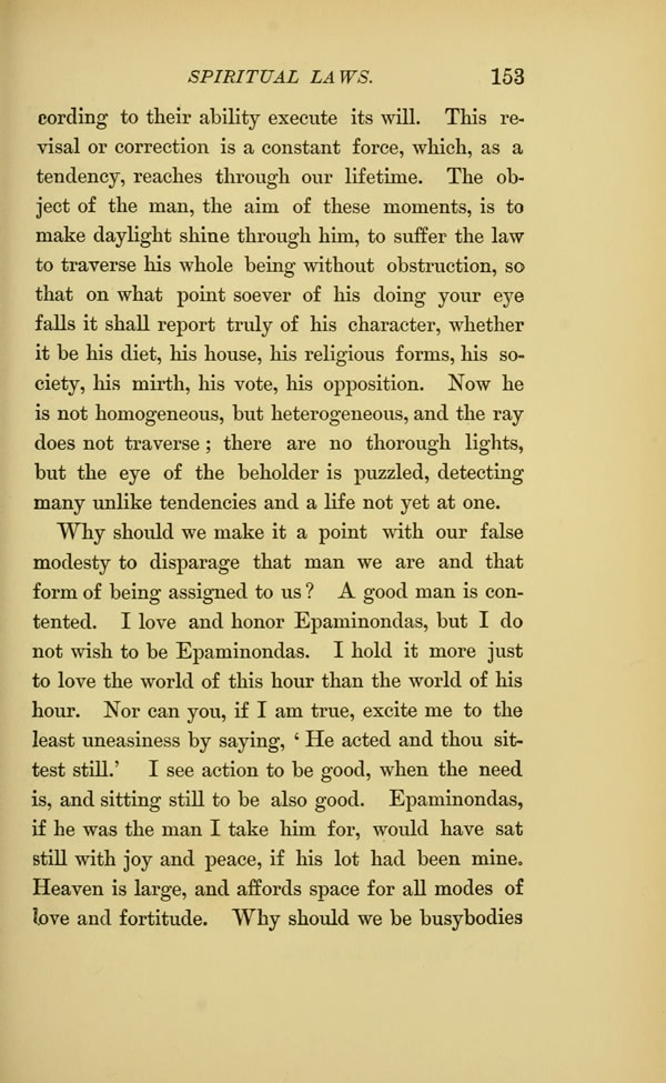 Why should we make it a point with our false modesty to disparage that man we are and that form of being assigned to us? A good man is contented. I love and honor Epaminondas, but I do not wish to be Epaminondas. I hold it more just to love the world of this hour than the world of his hour. Nor can you, if I am true, excite me to the least uneasiness by saying, He acted and thou sittest still.' I see action to be good, when the need is, and sitting still to be also good. Epaminondas, if he was the man I take him for, would have sat still with joy and peace, if his lot had been mine. Heaven is large, and affords space for all modes of love and fortitude. Why should we be busybodies
