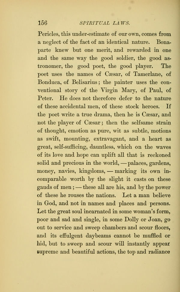 Pericles, this under-estimate of our own, comes from a neglect of the fact of an identical nature. Bonaparte knew but one merit, and rewarded in one and the same way the good soldier, the good astronomer, the good poet, the good player. The poet uses the names of Caesar, of Tamerlane, of Bonduca, of Belisarius; the painter uses the conventional story of the Virgin Mary, of Paul, of Peter. He does not therefore defer to the nature of these accidental men, of these stock heroes. If the poet write a true drama, then he is Caesar, and not the player of Caesar; then the selfsame strain of thought, emotion as pure, wit as subtle, motions as swift, mounting, extravagant, and a heart as great, self-sufficing, dauntless, which on the waves of its love and hope can uplift all that is reckoned solid and precious in the world, -- palaces, gardens, money, navies, kingdoms, marking its own incomparable worth by the slight it casts on these gauds of men -- these all are his, and by the power of these he rouses the nations. Let a man believe in God, and not in names and places and persons.