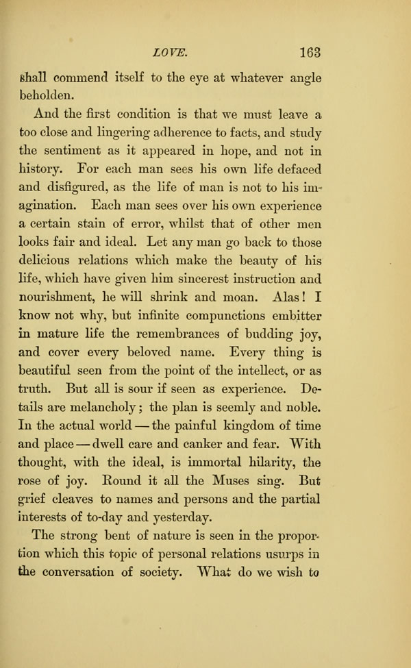 And the first condition is that we must leave a too close and lingering adherence to facts, and study the sentiment as it appeared in hope, and not in history. For each man sees his own life defaced and disfigured, as the life of man is not to his imagination. Each man sees over his own experience a certain stain of error, whilst that of other men looks fair and ideal. Let any man go back to those delicious relations which make the beauty of his life, which have given him sincerest instruction and nourishment, he will shrink and moan. Alas! I know not why, but infinite compunctions embitter in mature life the remembrances of budding joy, and cover every beloved name. Every thing is beautiful seen from the point of the intellect, or as truth. But all is sour if seen as experience. Details are melancholy; the plan is seemly and noble. In the actual world -- the painful kingdom of time and place -- dwell care and canker and fear. With thought, with the ideal, is immortal hilarity, the rose of joy. Round it all the Muses sing. But grief cleaves to names and persons and the partial interests of to-day and yesterday. The strong bent of nature is seen in the proportion which this topic of personal relations usurps in the conversation of society. What do we wish to