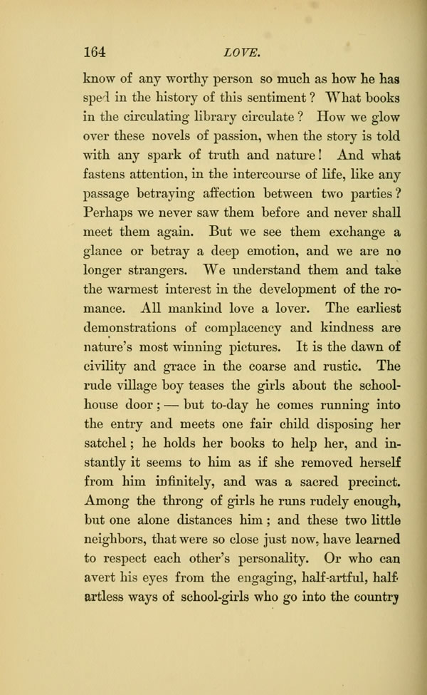 Perhaps we never saw them before and never shall meet them again. But we see them exchange a glance or betray a deep emotion, and we are no longer strangers. We understand them and take the warmest interest in the development of the romance. All mankind love a lover. The earliest demonstrations of complacency and kindness are nature's most winning pictures. It is the dawn of civility and grace in the coarse and rustic. The rude village boy teases the girls about the schoolhouse door; -- but to-day he comes running into the entry and meets one fair child disposing her satchel he holds her books to help her, and instantly it seems to him as if she removed herself from him infinitely, and was a sacred precinct.