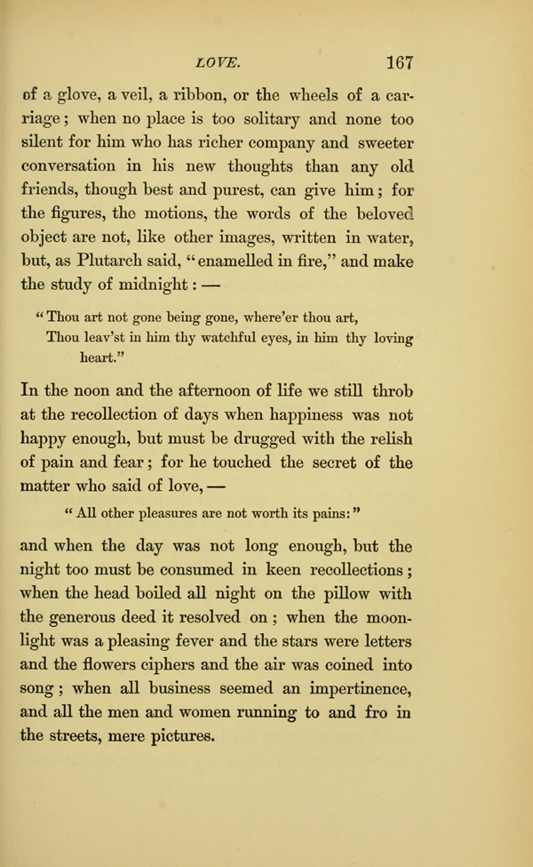 of a glove, a veil, a ribbon, or the wheels of a carriage; when no place is too solitary and none too silent for him who has richer company and sweeter conversation in his new thoughts than any old. friends, though best and purest, can give him; for the figures, the motions, the words of the beloved object are not, like other images, written in water, but, as Plutarch said, "enamelled in fire," and make the study of midnight: