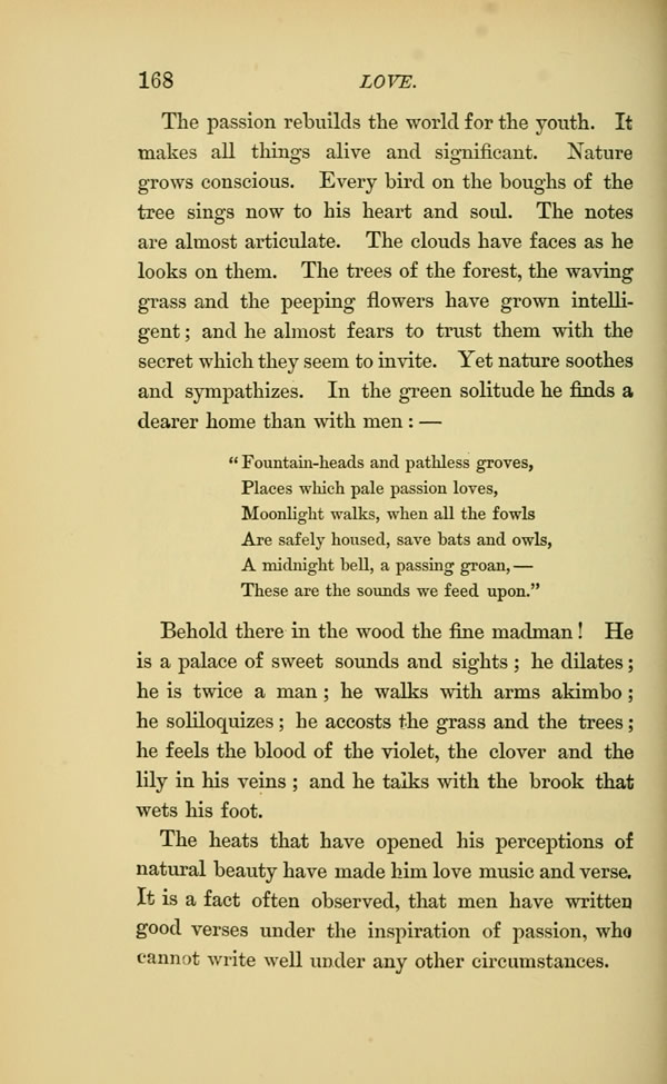 The heats that have opened his perceptions of natural beauty have made him love music and verse. It is a fact often observed, that men have written good verses under the inspiration of passion, who cannot write well under any other circumstances.