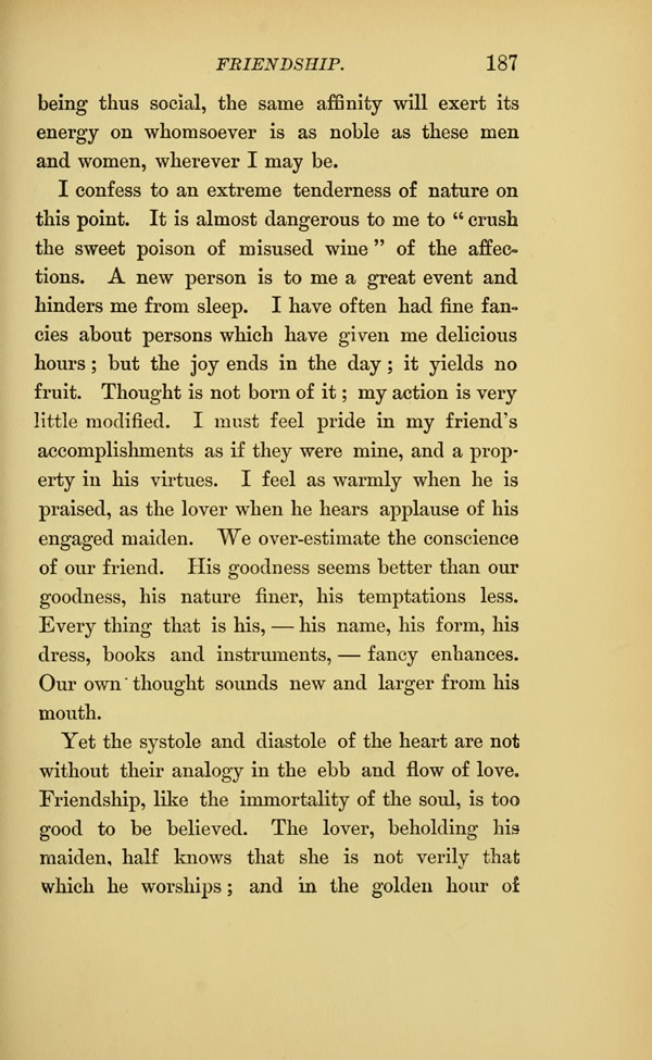 I confess to an extreme tenderness of nature on this point. It is almost dangerous to me to " crush the sweet poison of misused wine " of the affections. A new person is to me a great event and hinders me from sleep. I have often had fine fancies about persons which have given me delicious hours; but the joy ends in the day; it yields no fruit. Thought is not born of it my action is very little modified. I must feel pride in my friend's accomplishments as if they were mine, and a property in his virtues. I feel as warmly when he is praised, as the lover when he hears applause of his engaged maiden. We over-estimate the conscience of our friend. His goodness seems better than our goodness, his nature finer, his temptations less.