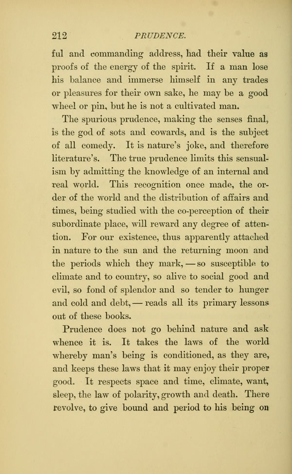 Prudence does not go behind nature and ask whence it is. It takes the laws of the world whereby man's being is conditioned, as they are, and keeps these laws that it may enjoy their proper good. It respects space and time, climate, want, sleep, the law of polarity, growth and death. There revolve, to give bound and period to his being on