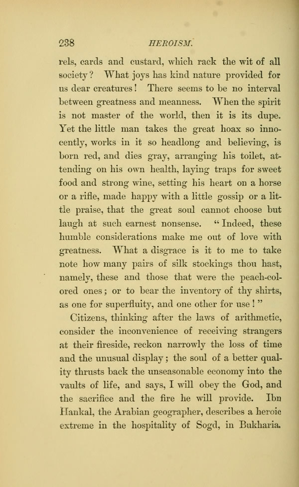 Yet the little man takes the great hoax so innocently, works in it so headlong and believing, is born red, and dies gray, arranging his toilet, attending on his own health, laying traps for sweet food and strong wine, setting his heart on a horse or a rifle, made happy with a little gossip or a little praise, that the great soul cannot choose but laugh at such earnest nonsense. "Indeed, these humble considerations make me out of love with greatness. What a disgrace is it to me to take note how many pairs of silk stockings thou hast, namely, these and those that were the peach-colored ones; or to bear the inventory of thy shirts, as one for superfluity, and one other for use!"
