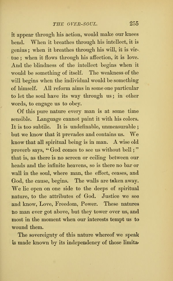 Of this pure nature every man is at some time sensible. Language cannot paint it with his colors. It is too subtile. It is undefinable, unmeasurable; but we know that it prevades and contains us. We know that all spiritual being is in man. A wise old proverb says, "God comes to see us without bell" that is, as there is no screen or ceiling between our heads and the infinite heavens, so is there no bar or wall in the soul, where man, the effect, ceases, and God, the cause, begins. The walls are taken away. We lie open on one side to the deeps of spiritual nature, to the attributes of God. Justice we see and know, Love, Freedom, Power. These natures no man ever got above, but they tower over us, and most in the moment when our interests tempt us to wound them.
