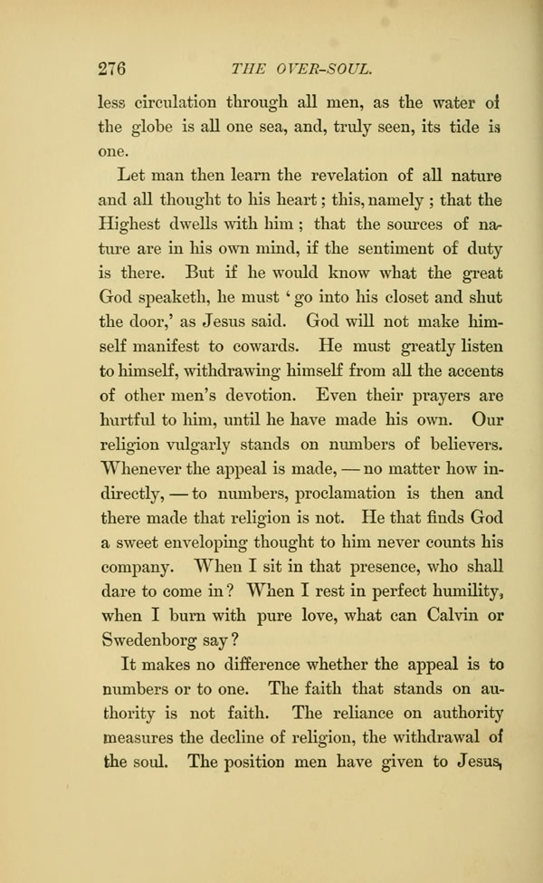 Let man then learn the revelation of all nature and all thought to his heart; this, namely; that the Highest dwells with him; that the sources of nature are in his own mind, if the sentiment of duty is there. But if he would know what the great God speaketh, he must 'go into his closet and shut the door,' as Jesus said. God will not make himself manifest to cowards. He must greatly listen to himself, withdrawing himself from all the accents of other men's devotion. Even their prayers are hurtful to him, until he have made his own. Our religion vulgarly stands on numbers of believers.