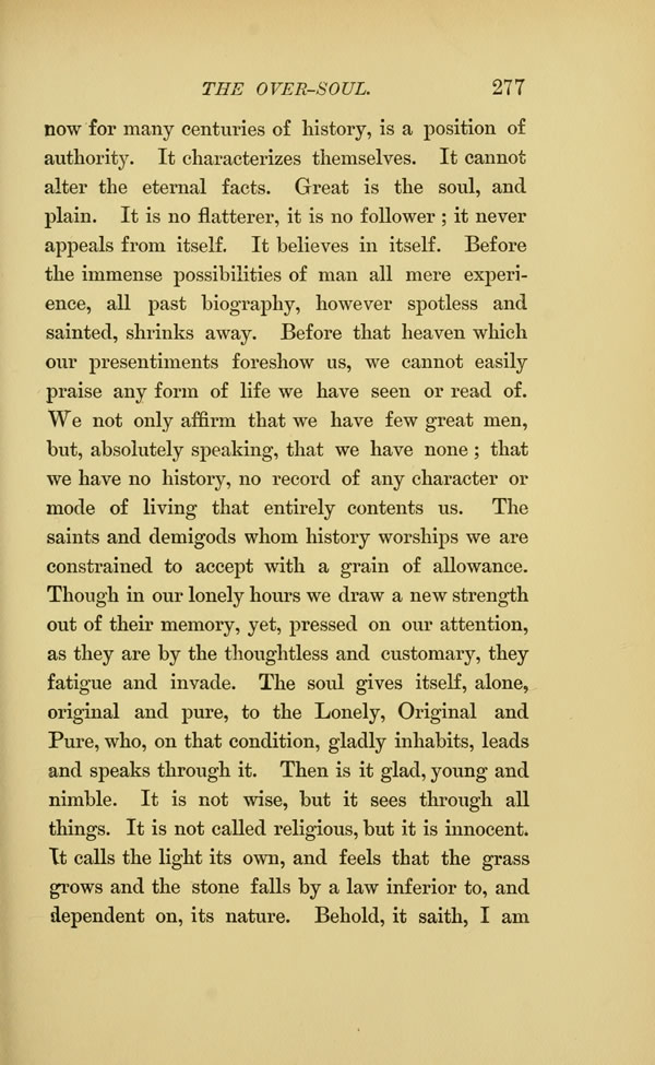 now for many centuries of history, is a position of authority. It characterizes themselves. It cannot alter the eternal facts. Great is the soul, and plain. It is no flatterer, it is no follower; it never appeals from itself. It believes in itself. Before the immense possibilities of man all mere experience, all past biography, however spotless and sainted, shrinks away. Before that heaven which our presentiments foreshow us, we cannot easily praise any form of life we have seen or read of.