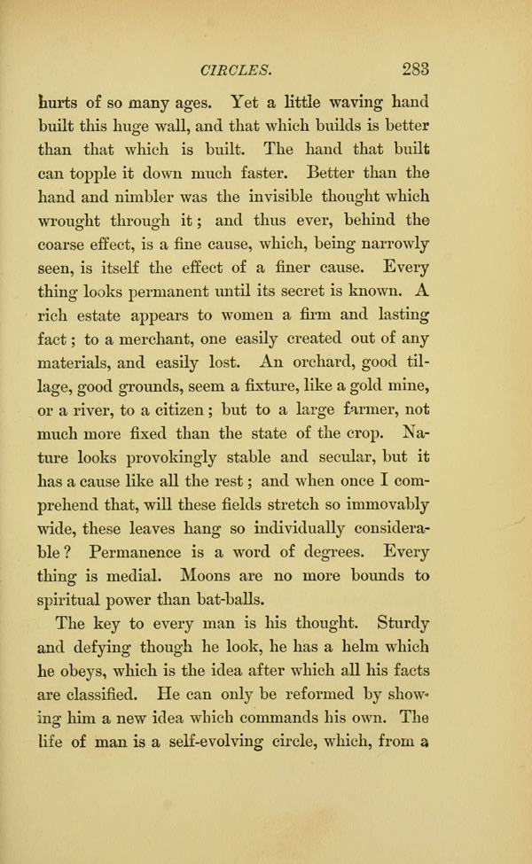 hurts of so many ages. Yet a little waving hand built this huge wall, and that which builds is better than that which is built. The hand that built can topple it down much faster. Better than the hand and nimbler was the invisible thought which wrought through it; and thus ever, behind the coarse effect, is a fine cause, which, being narrowly seen, is itself the effect of a finer cause. Every thing looks permanent until its secret is known. A rich estate appears to women a firm and lasting fact; to a merchant, one easily created out of any materials, and easily lost. An orchard, good tillage, good grounds, seem a fixture, like a gold mine, or a river, to a citizen but to a large farmer, not much more fixed than the state of the crop. Nature looks provokingly stable and secular, but it has a cause like all the rest; and when once I comprehend that, will these fields stretch so immovably wide, these leaves hang so individually considerable? Permanence is a word of degrees. Every thing is medial. Moons are no more bounds to spiritual power than bat-balls.