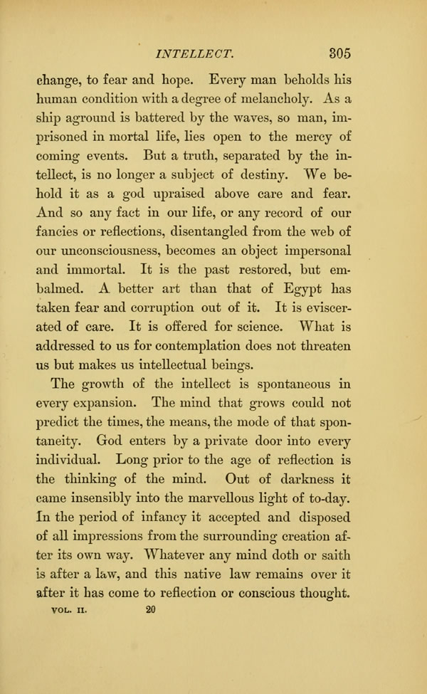 The growth of the intellect is spontaneous in every expansion. The mind that grows could not predict the times, the means, the mode of that spontaneity. God enters by a private door into every individual. Long prior to the age of reflection is the thinking of the mind. Out of darkness it came insensibly into the marvellous light of to-day. In the period of infancy it accepted and disposed of all impressions from the surrounding creation after its own way. Whatever any mind cloth or with is after a law, and this native law remains over it after it has come to reflection or conscious thought.