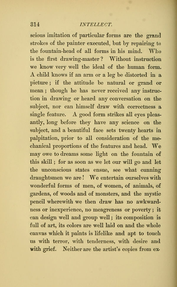 A child knows if an arm or a leg be distorted in a picture; if the attitude be natural or grand or mean; though he has never received any instruction in drawing or heard any conversation on the subject, nor can himself draw with correctness a single feature. A good form strikes all eyes pleasantly, long before they have any science on the subject, and a beautiful face sets twenty hearts in palpitation, prior to all consideration of the mechanical proportions of the features and head. We may owe to dreams some light on the fountain of this skill; for as soon as we let our will go and let the unconscious states ensue, see what cunning draughtsmen we are! We entertain ourselves with wonderful forms of men, of women, of animals, of gardens, of woods and of monsters, and the mystic pencil wherewith we then draw has no awkwardness or inexperience, no meagreness or poverty; it can design well and group well; its composition is full of art, its colors are well laid on and the whole canvas which it paints is lifelike and apt to touch us with terror, with tenderness, with desire and with grief. Neither are the artist's copies from experience