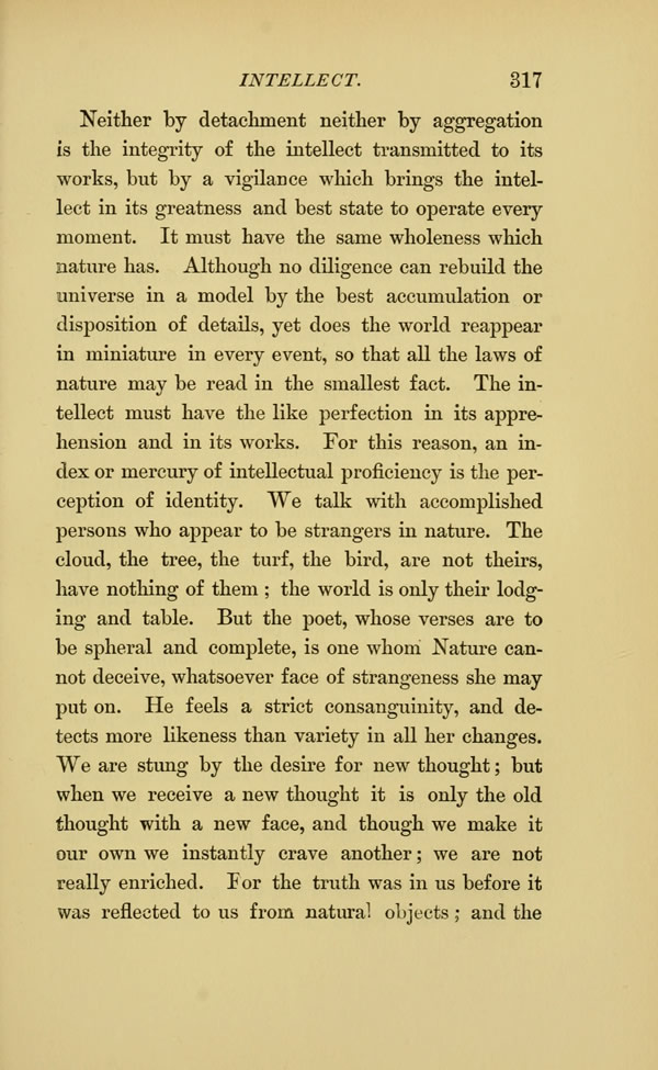 Neither by detachment neither by aggregation is the integrity of the intellect transmitted to its works, but by a vigilance which brings the intellect in its greatness and best state to operate every moment. It must have the same wholeness which nature has. Although no diligence can rebuild the universe in a model by the best accumulation or disposition of details, yet does the world reappear in miniature in every event, so that all the laws of nature may be read in the smallest fact. The intellect must have the like perfection in its apprehension and in its works. For this reason, an index or mercury of intellectual proficiency is the perception of identity. We talk with accomplished persons who appear to be strangers in nature. The cloud, the tree, the turf, the bird, are not theirs, have nothing of them; the world is only their lodging and table. But the poet, whose verses are to be spheral and complete, is one whom Nature cannot deceive, whatsoever face of strangeness she may put on. He feels a strict consanguinity, and detects more likeness than variety in all her changes.