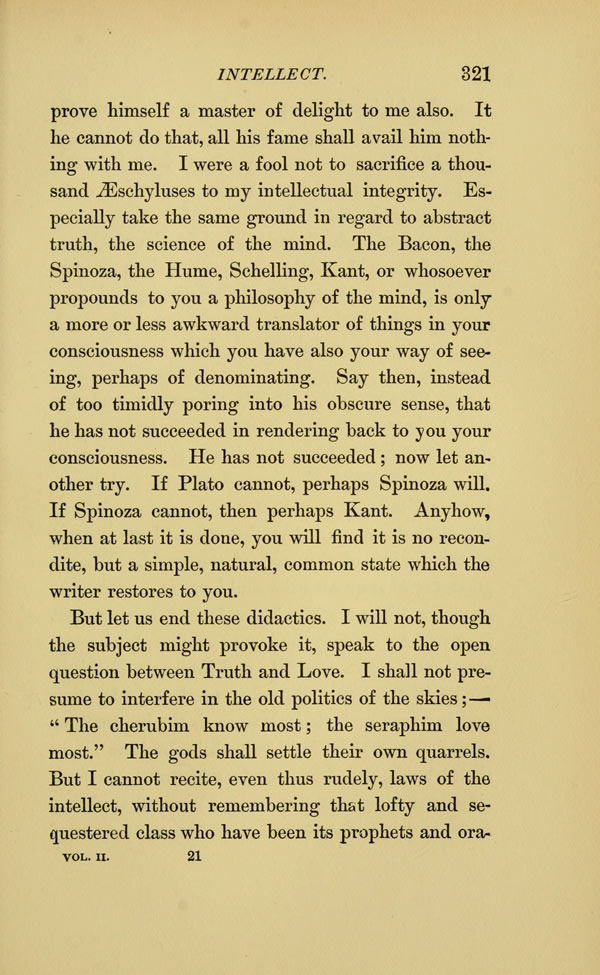 himself a master of delight to me also. It he cannot do that, all his fame shall avail him nothing with me. I were a fool not to sacrifice a thousand AEschyluses to my intellectual integrity. Especially take the same ground in regard to abstract truth, the science of the mind. The Bacon, the Spinoza, the Hume, Schelling, Kant, or whosoever propounds to you a philosophy of the mind, is only a more or less awkward translator of things in your consciousness which you have also your way of seeing, perhaps of denominating. Say then, instead of too timidly poring into his obscure sense, that he has not succeeded in rendering back to you your consciousness. He has not succeeded; now let another try. If Plato cannot, perhaps Spinoza will.