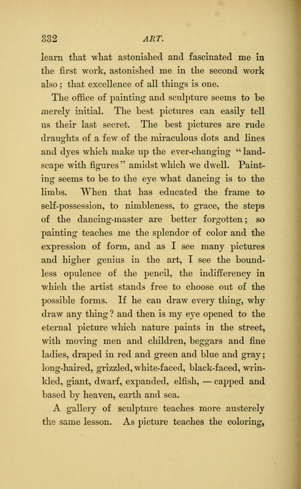 The office of painting and sculpture seems to be merely initial. The best pictures can easily tell us their last secret. The best pictures are rude draughts of a few of the miraculous dots and lines and dyes which make up the ever-changing "landscape with figures" amidst which we dwell. Painting seems to be to the eye what dancing is to the limbs. When that has educated the frame to self-possession, to nimbleness, to grace, the steps of the dancing-master are better forgotten so painting teaches me the splendor of color and the expression of form, and as I see many pictures and higher genius in the art, I see the boundless opulence of the pencil, the indifferency in which the artist stands free to choose out of the possible forms. If he can draw every thing, why draw any thing? and then is my eye opened to the eternal picture which nature paints in the street, with moving men and children, beggars and fine ladies, draped in red and green and blue and gray; long-haired, grizzled, white-faced, black-faced, wrinkled, giant, dwarf, expanded, elfish, capped and based by heaven, earth and sea.